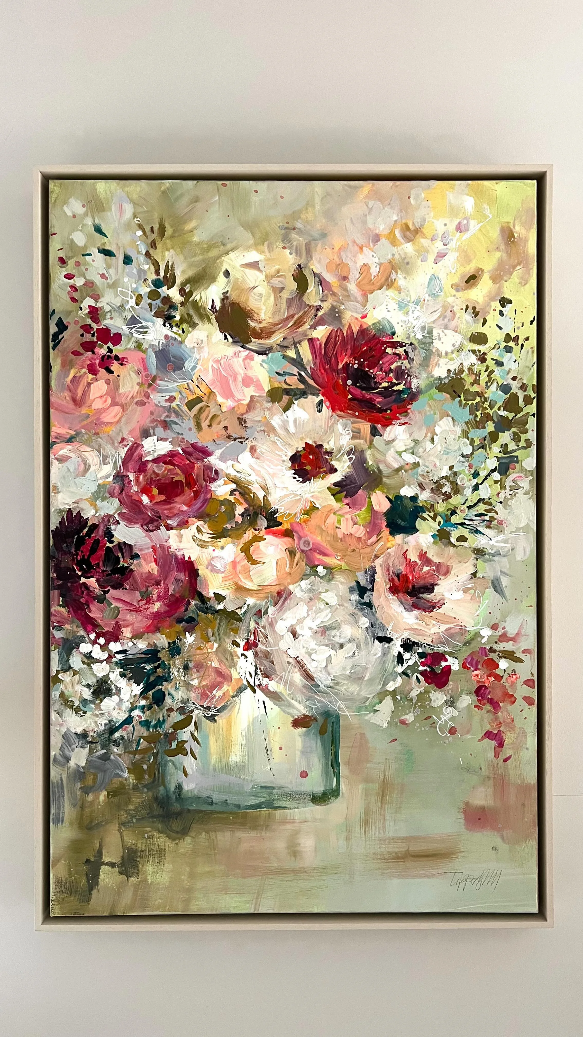 acrylic on canvas in a dark wood tray frame